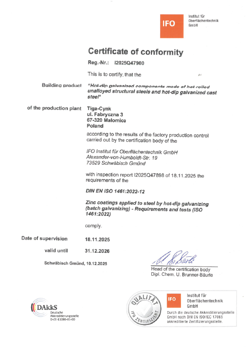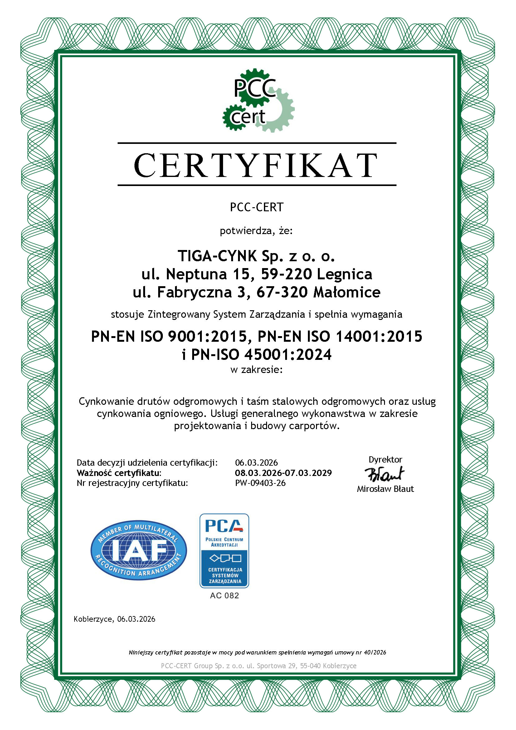 Najważniejszym celem firmy Tiga-Cynk jest produkowanie wyrobów i świadczenie usług na najwyższym poziomie jakościowym. Dbamy o podnoszenie satysfakcji i zaufania Klientów, a także o nieustanny rozwój firmy. Ciągłe doskonalenie jakości precesów, produktów i usług jest dla nas kluczowe. Uzyskane certyfiakty są dowodem naszego zaangażowania w jakość, bezpieczeństwo i profesjonalizm.